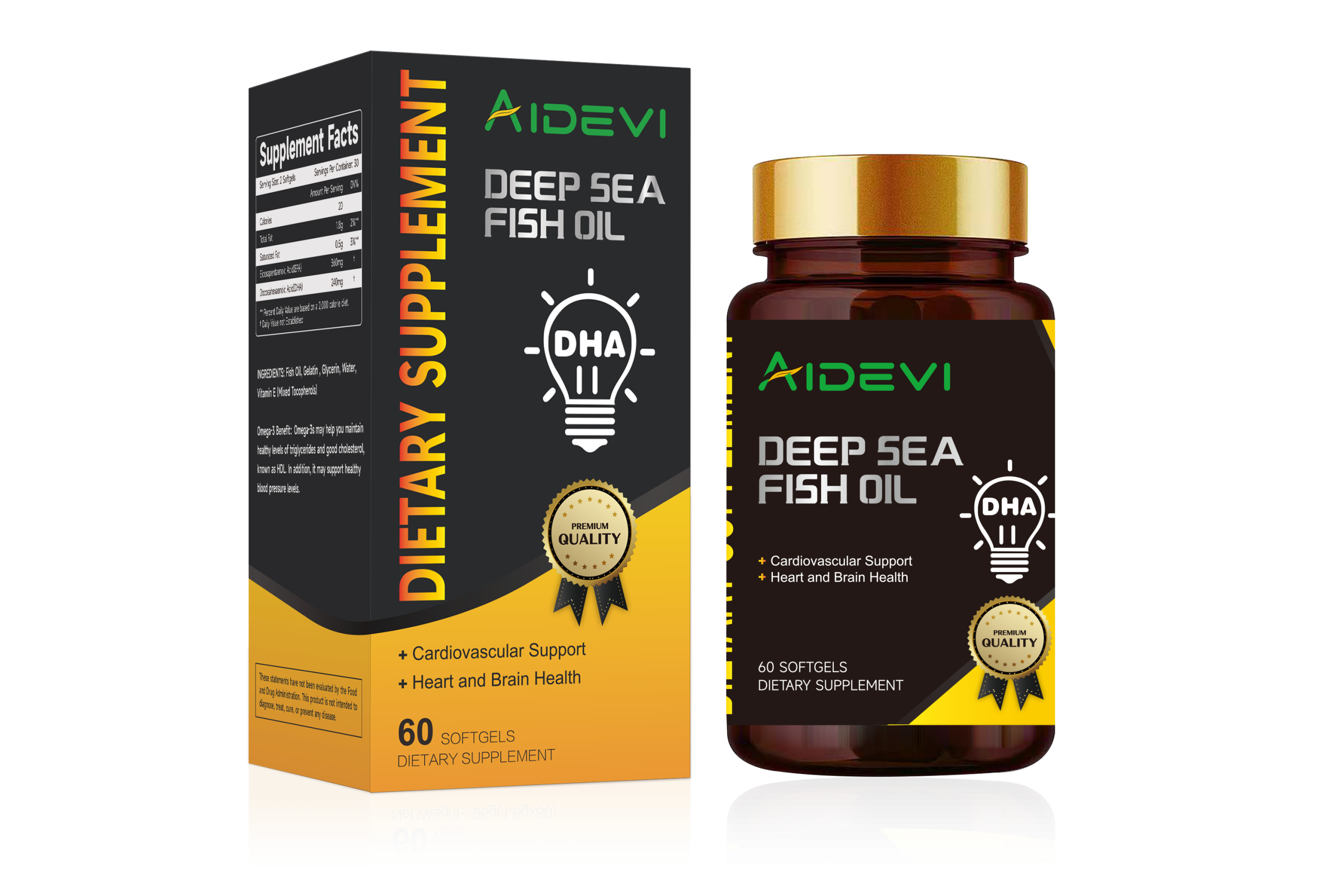 AIDEVI’s Deep Sea Fish Oil softgels are a premium dietary supplement sourced from deep-sea fish, ensuring high purity and potency.